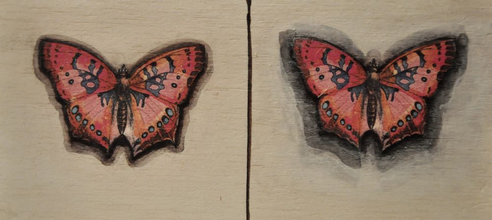На первом изображении тени у бабочки нет совсем, и она выглядит просто приклеенной к поверхности, как, собственно, и есть на самом деле. На втором изображении бабочка приобрела объём , так как она начала отбрасывать небольшую тень. На третьем изображении она начала "взлетать" , так как тень увеличилась в размере. Ну, а на четвертом она уже находится довольно высоко над поверхностью — тень стала ещё больше и светлее.