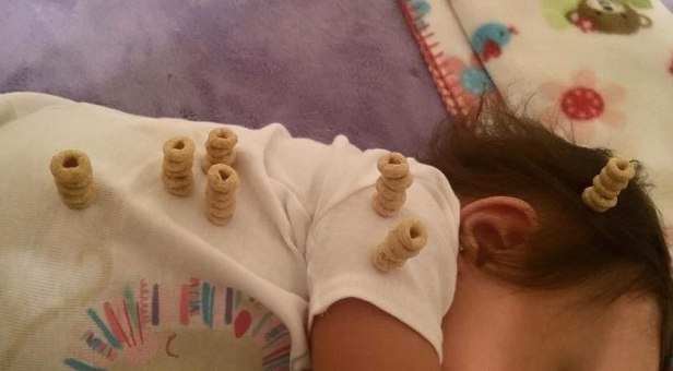 У американских папочек новый забава в соцсетях: кто сложит на своем спящем маленьком ребенке самую высокую башенку из сладких сахарных колечек.