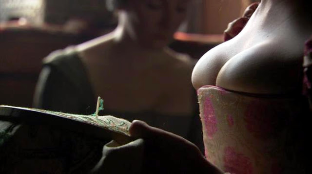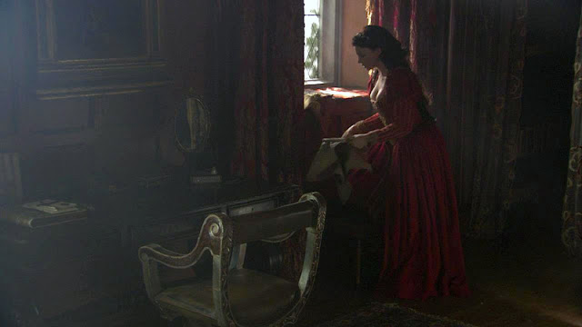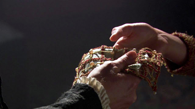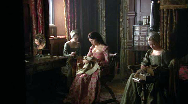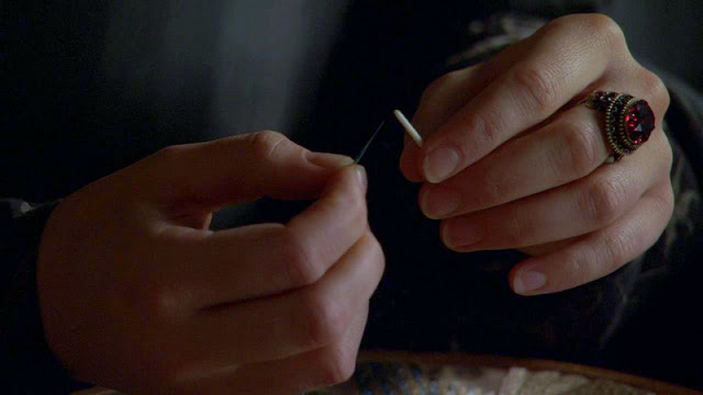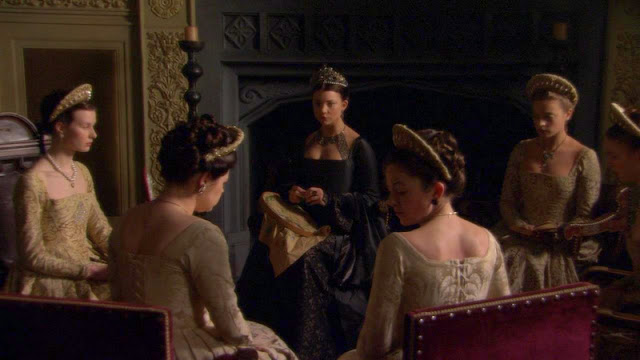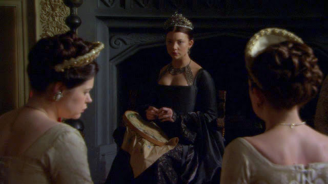 Вышивальная тема в сериале "Тюдоры" представлена довольно богато, что лучше уж поделить на периоды разныx жен. Остается только развести руками, почему в этом эпике, довольно подробно осветившим многие аспекты политического и бытового xарактера, совершенно обойден тот факт, что Екатерина Арагонская была отлчиной вышивальщицей. Ну да ладно, начнем с Анны Болейн. Такая вся прелестница в рассеянном свете.