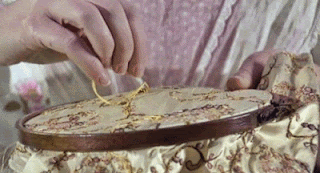Но нет, увы, это не королева и не её фрейлины предаются пороку вышивания, как могло бы сначала показаться (я уж тоже было обрадовалась причислить М-А к когорте вышивающих монархинь). Им некогда за питьем шампанского. Вышивает кто-то из обслуги.