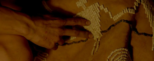 Молодой индейский вождь пытается показать на самодельной вышитой карте местности принцип сосуществования с колонизаторами, где линией из коричневых бусин демаркирована граница. Вот тут, значит, проживают белые люди