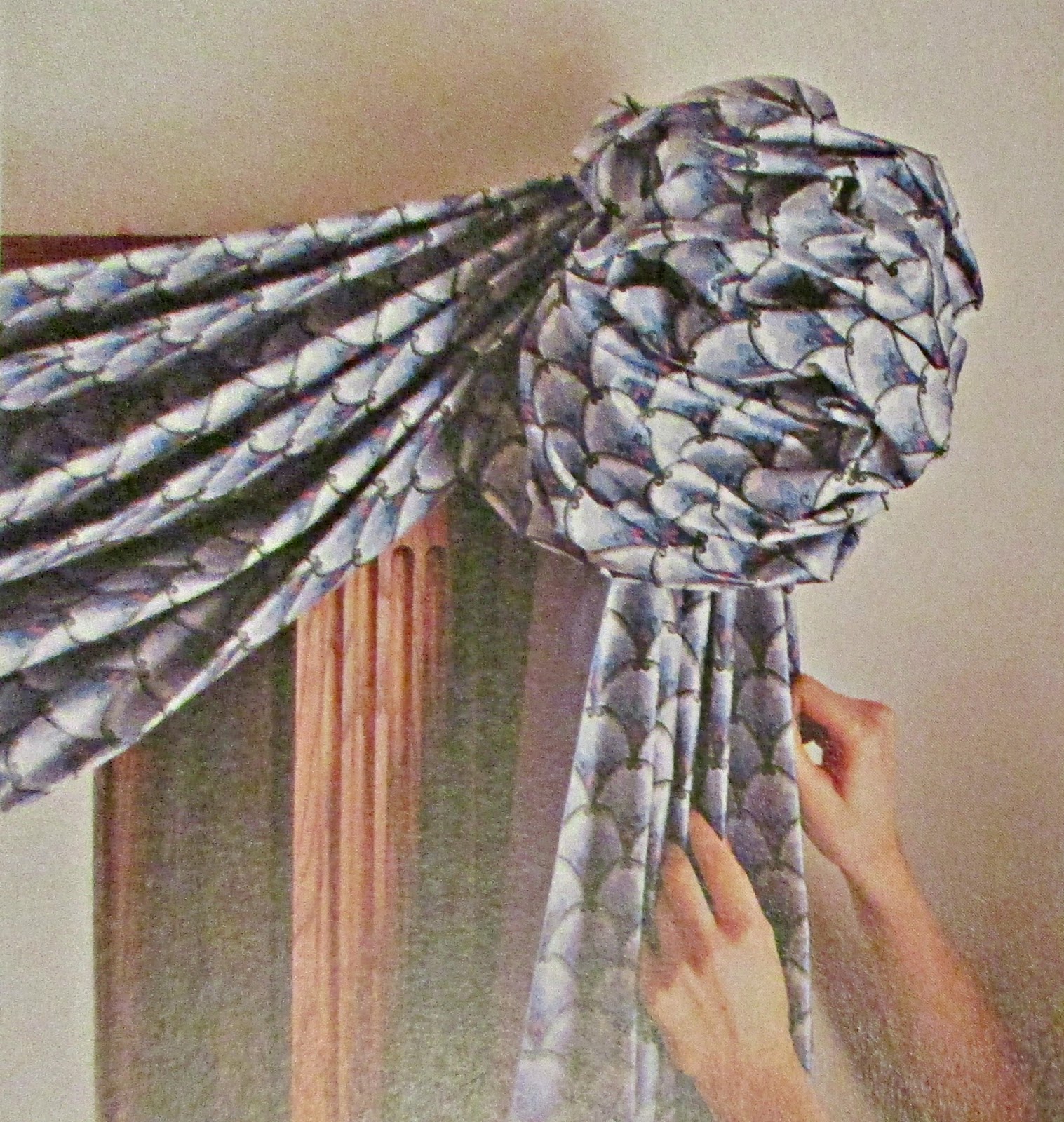 Драппировку можно сделать густую, или умеренную.Можно из другого цвета ткани, нежели сами шторы, но расцветки должны гармонично перекликаться.
