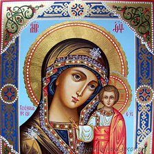 Казанская икона Божией Матери - чудотворная икона Богородицы - одна из самых чтимых икон Русской православной церкви. Иконографию Казанской иконы принято относить к сокращённому варианту "Одигитрии". Такие иконы восходят к первообразу, хранившемуся во Влахернском храме в Константинополе. Богородица изображается фронтально, в характерных одеждах, с небольшим наклоном головы к Младенцу. На одной руке Богородицы восседает Младенец Иисус Христос, который представлен строго в анфас, фигура ограничена по пояс, видна только правая рука с двуперстным жестом. В иконах типа "Одигитрия" Богородица указывает рукой на Христа. Казанский образ - оплечный, поэтому указания рукой мы не видим.