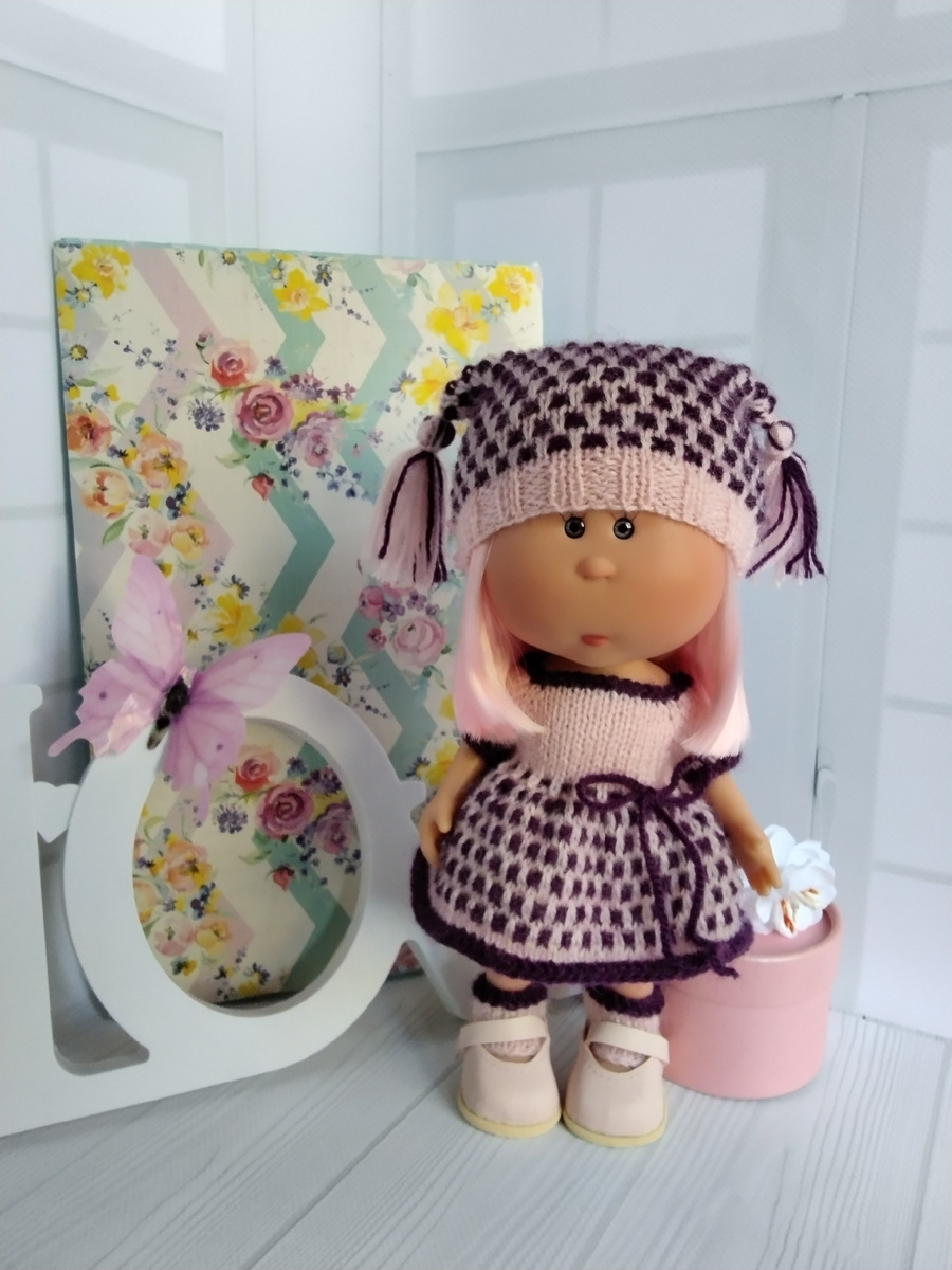 Розовая нить. 10 рядов лицевой гладью. Закрываем все петли, сшиваем.