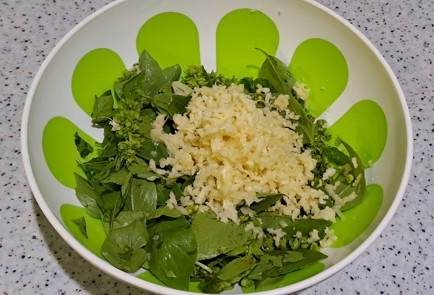 4.Чеснок мелко нарубить или выдавить через пресс. Выложить в емкость к базилику.