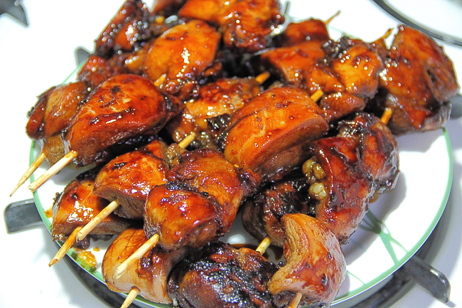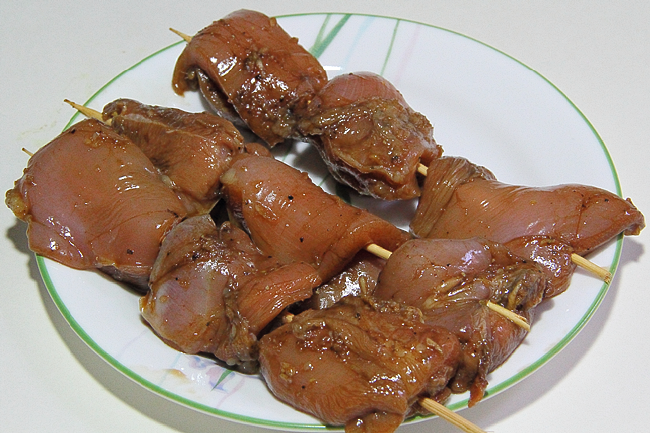 Далее насадить мясо на деревянные шпажки (опционально, можно просто поджарить на сковороде).