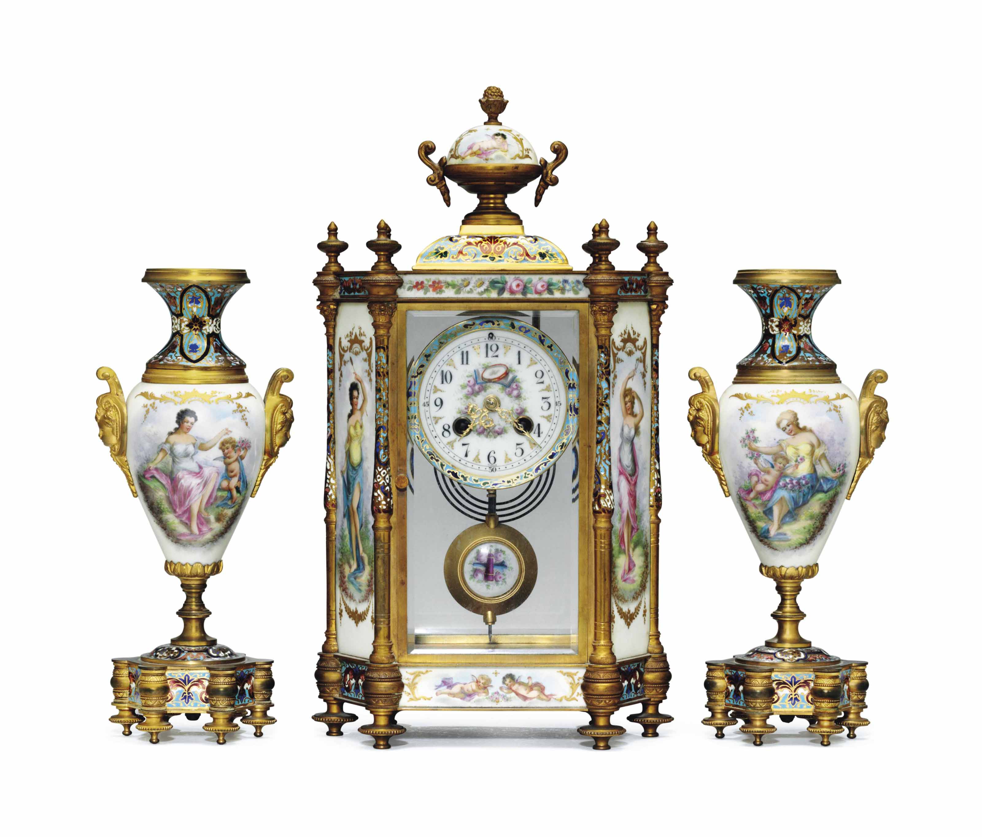 AN ORMOLU AND CHAMPLEVE MOUNTED SEVRES STYLE PORCELAIN THREE-PIECE CLOCK GARNITURE