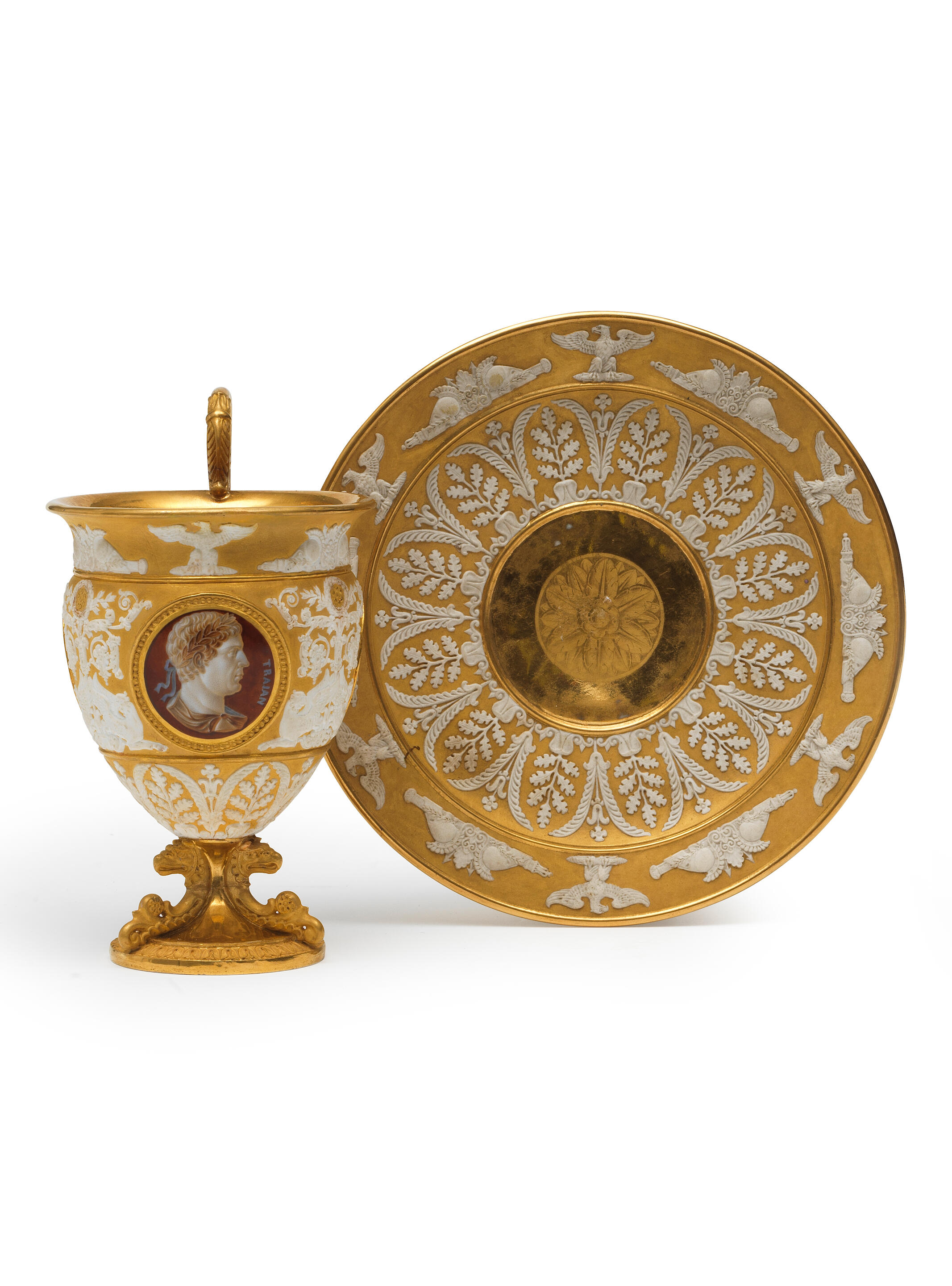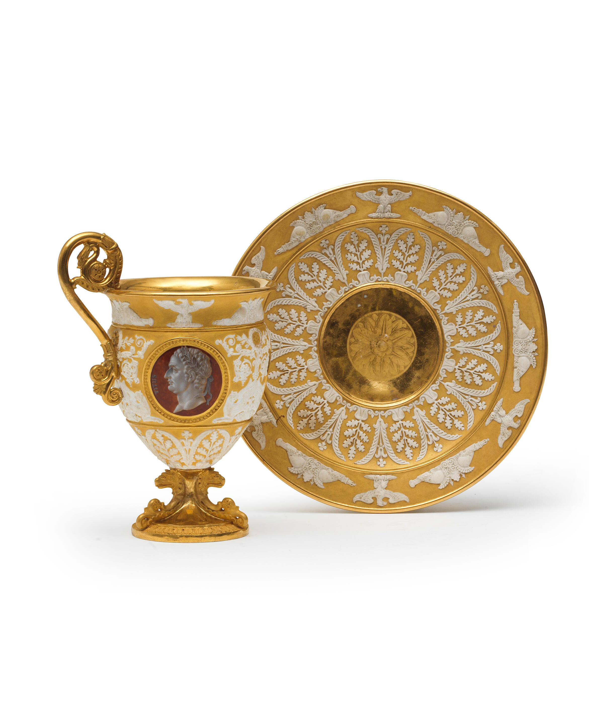 A rare Sèvres biscuit and gilt cameo cup and saucer, circa 1815-25