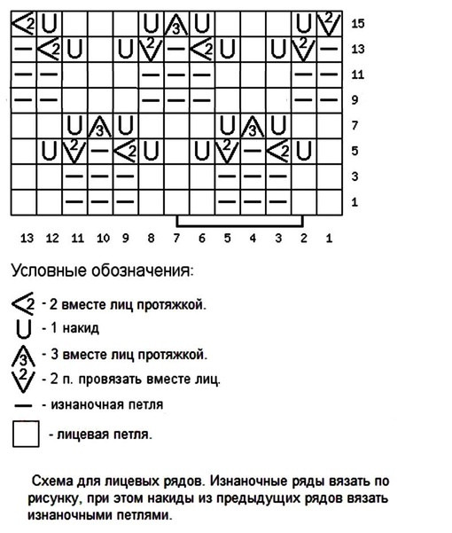 13й ряд: 1 изн, *2 вместе лиц с наклоном вправо, накид, 1 лиц, накид, 2 вместе лиц с наклоном влево протяжкой, 1 изн.*