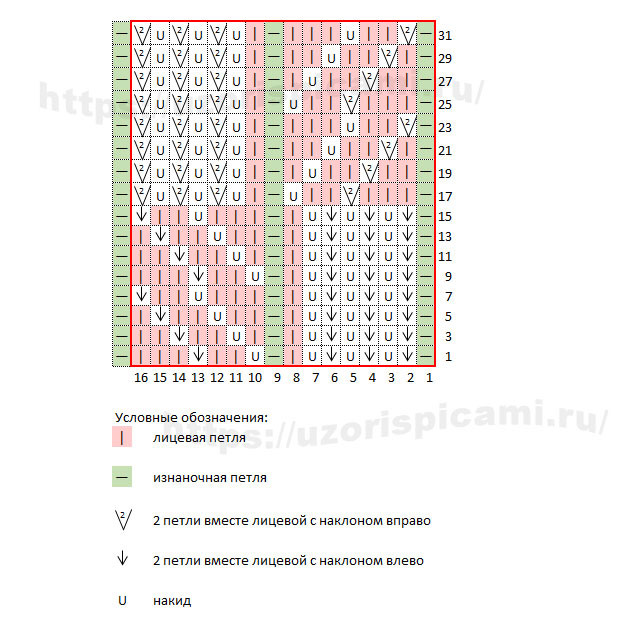 Раппорт узора состоит из 6и петель + 1 петля для симметрии при поворотном вязании, и 16и рядов.