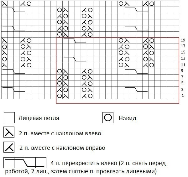 19 ряд: 1 кром, 4 лиц, 1 накид, 2 п. вместе лиц. с наклоном вправо, 2 лиц, 2 п. вместе лиц. с наклоном влево, 1 накид, 5 лиц, 4 п. перекрестить влево, 1 лиц, 1 кром.