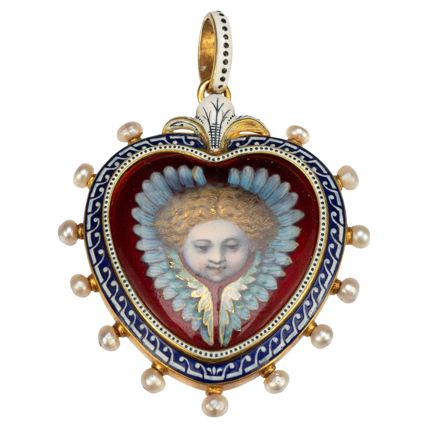 Enameled Heart-Shaped Pendant with Cherub & Seed Pearls by Carlo Giuliano c.1880