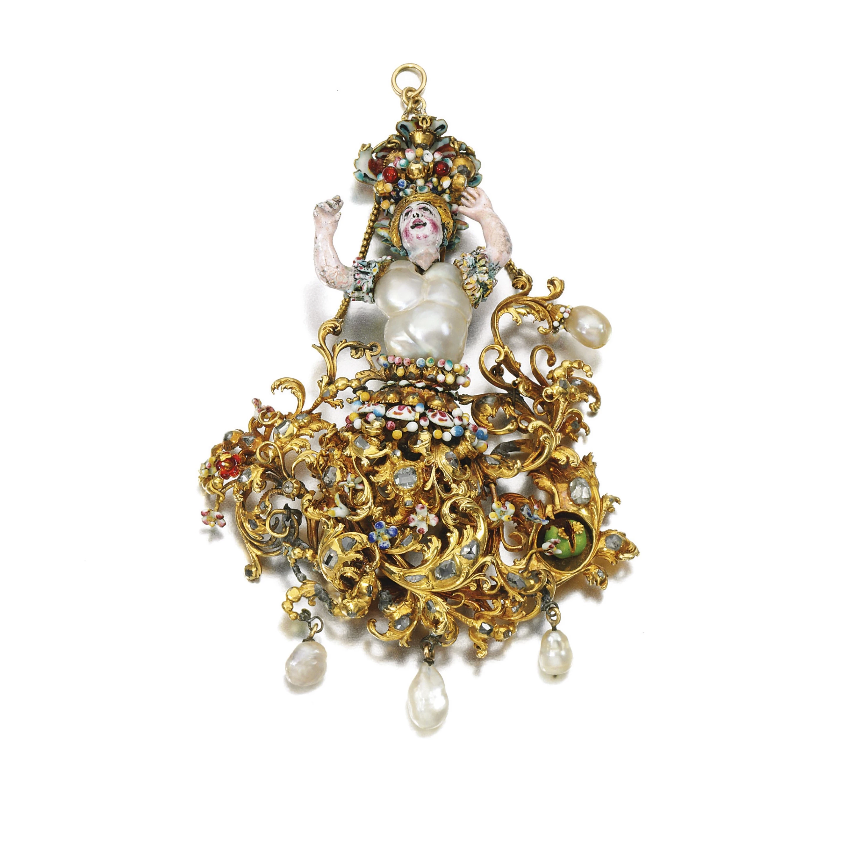 Gold, baroque pearl, enamel and diamond pendant, Southern Italian, 17th Century