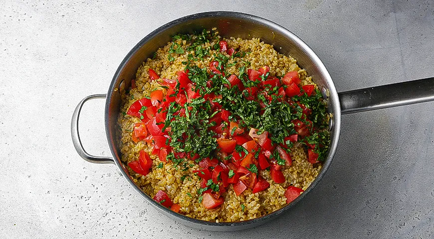 Булгур — крупа из пшеницы, которую можно заменить на родственный кускус, если очень торопитесь. Он готовится за считаные минуты.