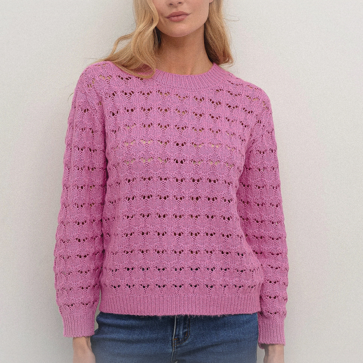 Мягкий лиловый цвет и ажурный узор с вертикальными «стрелами» — всё здесь говорит о лёгкости и приближающемся тепле. Фасон прямой, с широкими рукавами, чуть укороченный. Идеально подойдёт под шорты или высокие джинсы.