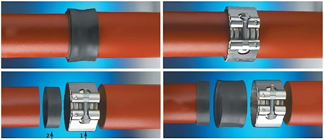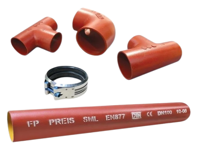Безраструбные трубы (SML, AHB). Современные системы, где трубы имеют гладкие цилиндрические концы и соединяются при помощи металлических хомутов с резиновыми уплотнителями. Преимущества: высокая герметичность, виброустойчивость, лёгкий монтаж без сварки и цемента. Применение: преимущественно внутренние сети зданий (DN 50–150) — стояки, сантехнические узлы, технические помещения. Такие системы активно применяются в Казахстане, России и Европе при строительстве современных жилых и коммерческих зданий, где важны шумоизоляция и пожаробезопасность.