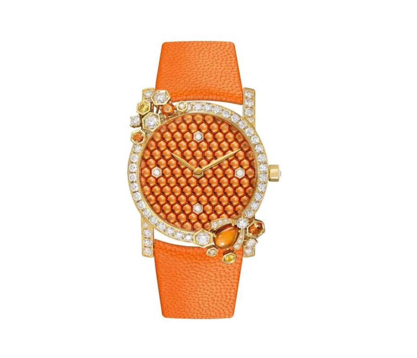 Watch in 18k yellow gold set with brilliant-cut diamonds, brilliant-cut orange and yellow sapphires, bee set with brilliant-cut diamonds and orange sapphire cabochon, strap in orange satin by Chaumet