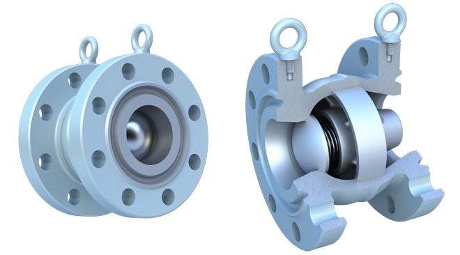 В шаровых обратных клапанах, как следует из их названия, в качестве запорного элемента используется золотник, выполненный в виде шара. Большой размер не позволяет применять их в качестве межфланцевых запорных устройств.