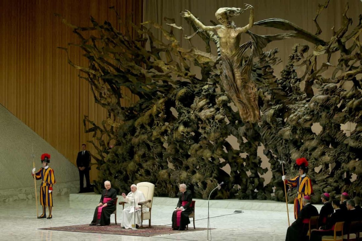 Скульптура Перикле Фаццини "Воскресение Христа из взорванного ядерным взрывом Гефсиманского сада", 1977 год, Ватикан В 1977 году в аудиенц-зале Папы Римского установили неприятную, вызывающую тревожное и депрессивное чувство скульптуру "Воскресение", которая тут же вызвала множество нареканий среди верующих за свой ужасающий внешний вид.