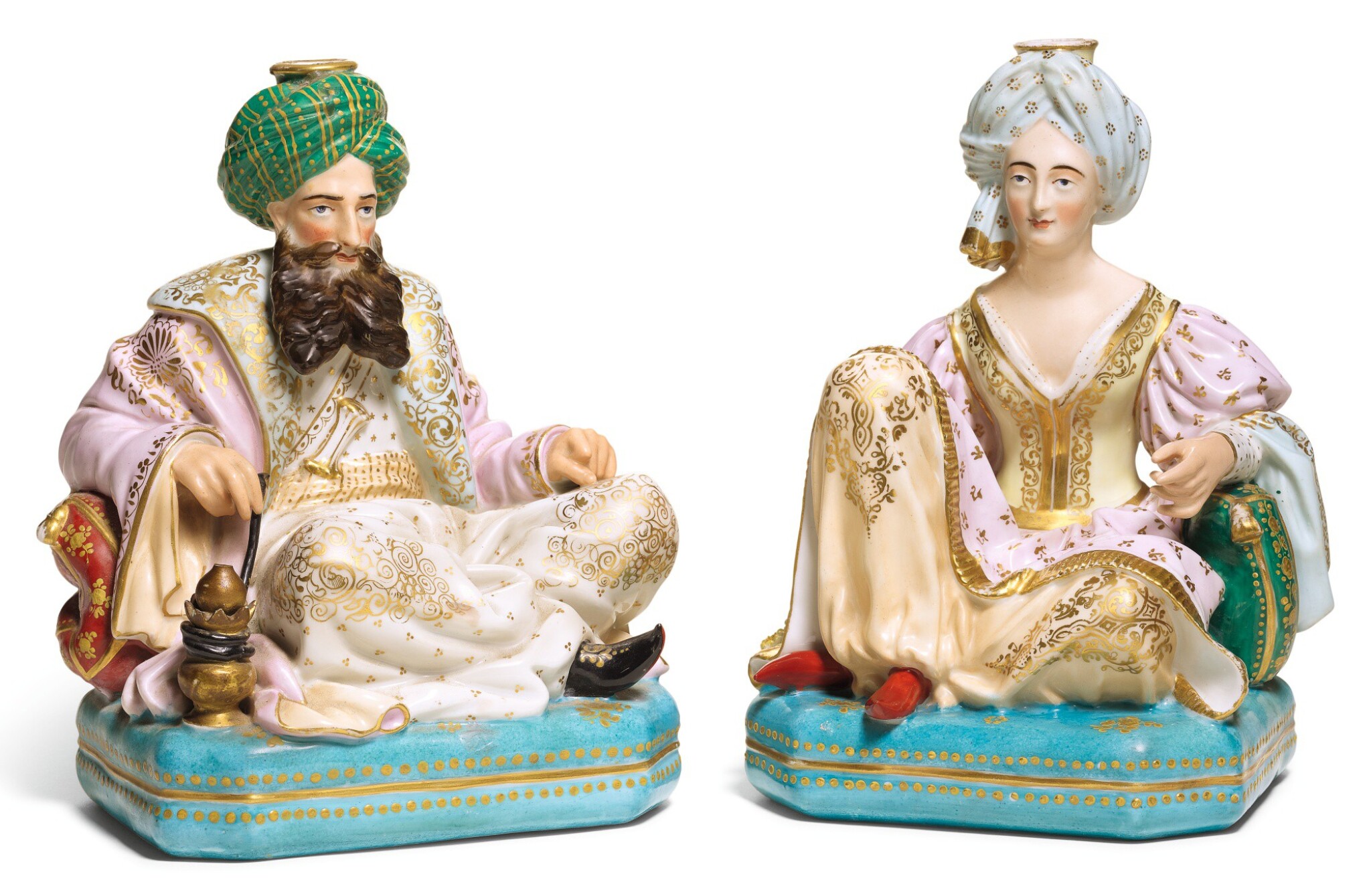 TWO PORCELAIN CONTAINERS MODELLED AS A SEATED SULTAN AND SULTANA, ATTRIBUTED TO JACOB PETIT, FRANCE, 19TH CENTURY
