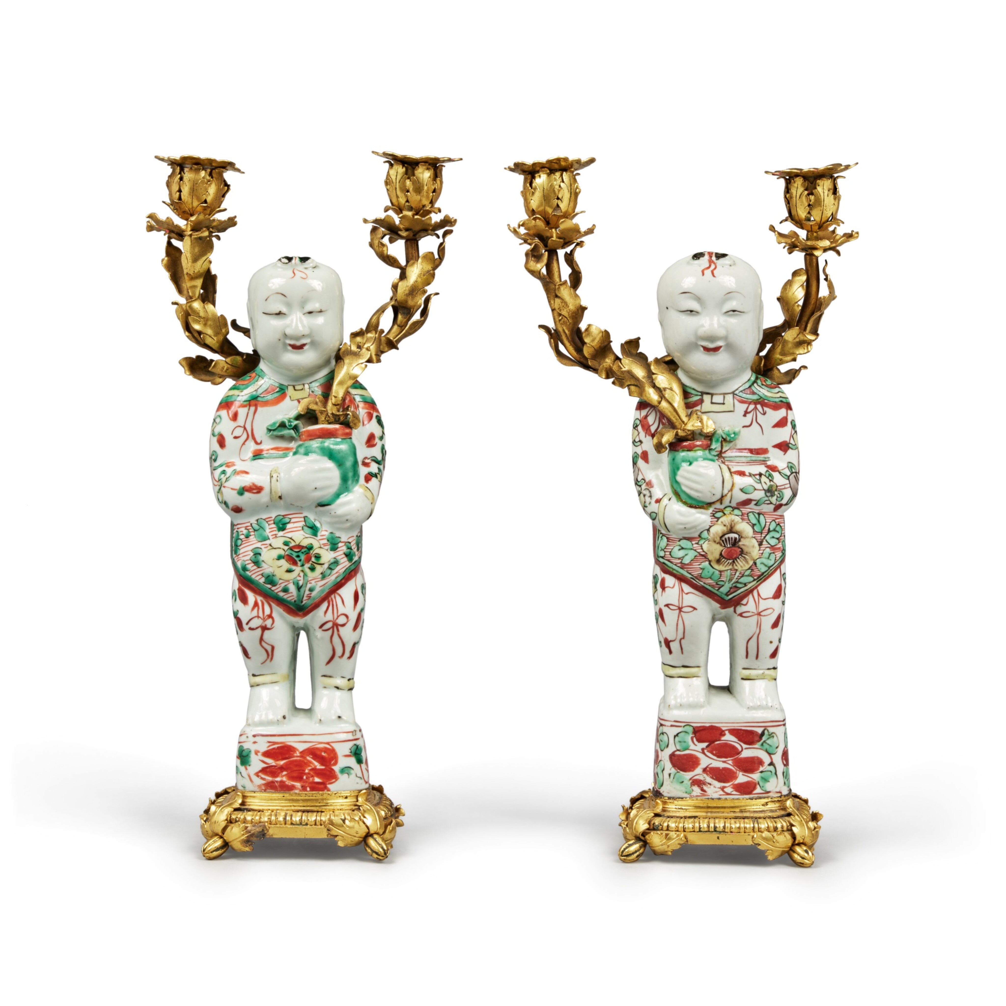 A Pair of French Gilt Bronze and Chinese Famille Verte Porcelain Boys mounted as Two-Light Candelabra, 19th Century