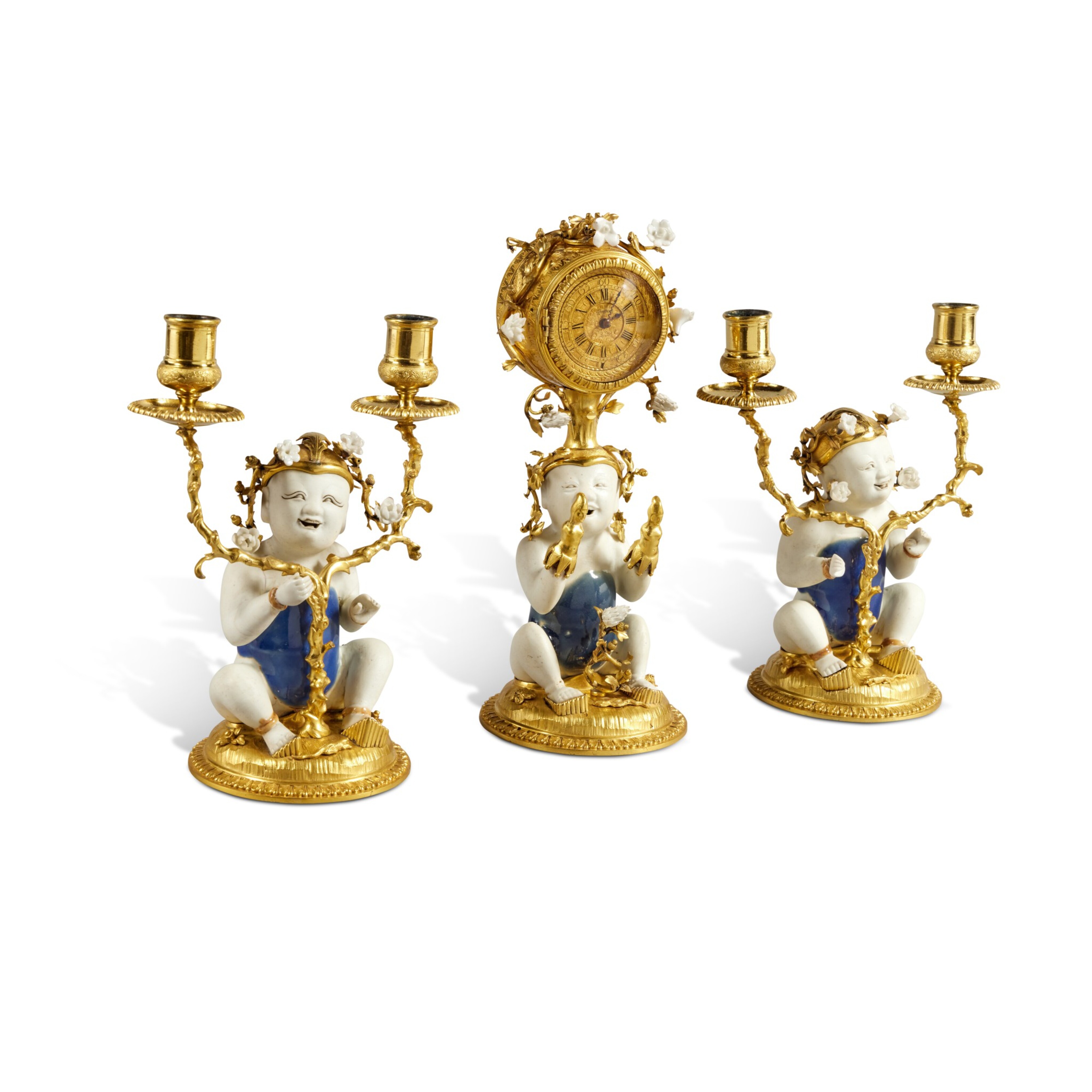 A Gilt-Bronze Mounted Chinese Porcelain Three-Piece Clock Garniture, Including a Clock and a Pair of Two-light Candelabra, Probably Viennese, Second Quarter 18th Century