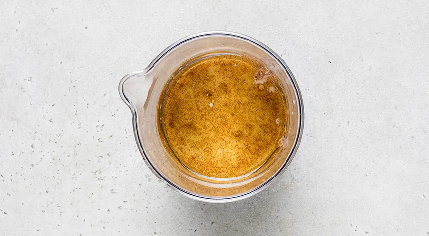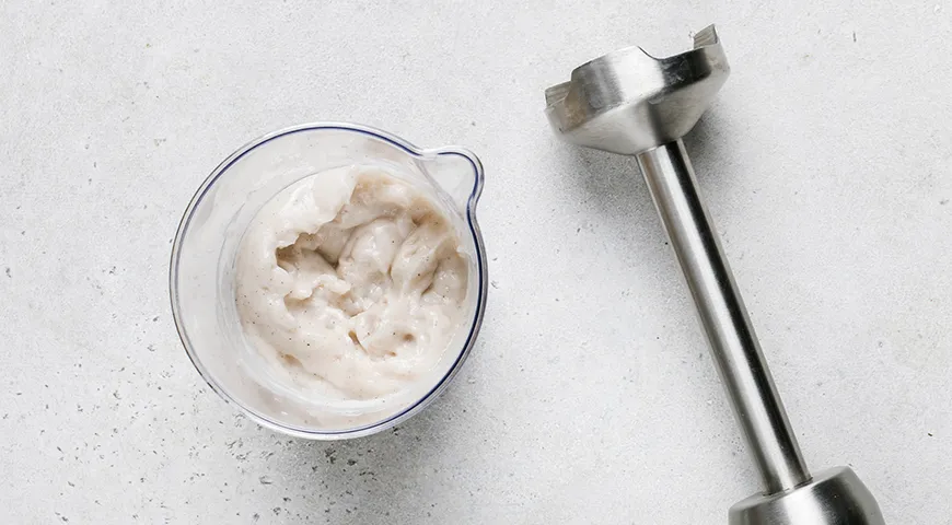 Взбейте ингредиенты, находящиеся в стакане, погружным блендером до получения однородной, гладкой, глянцевой и очень красивой эмульсии. Это будет основа для домашней шоколадной пасты.