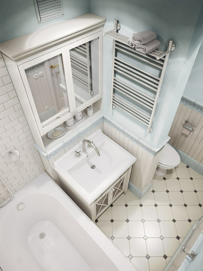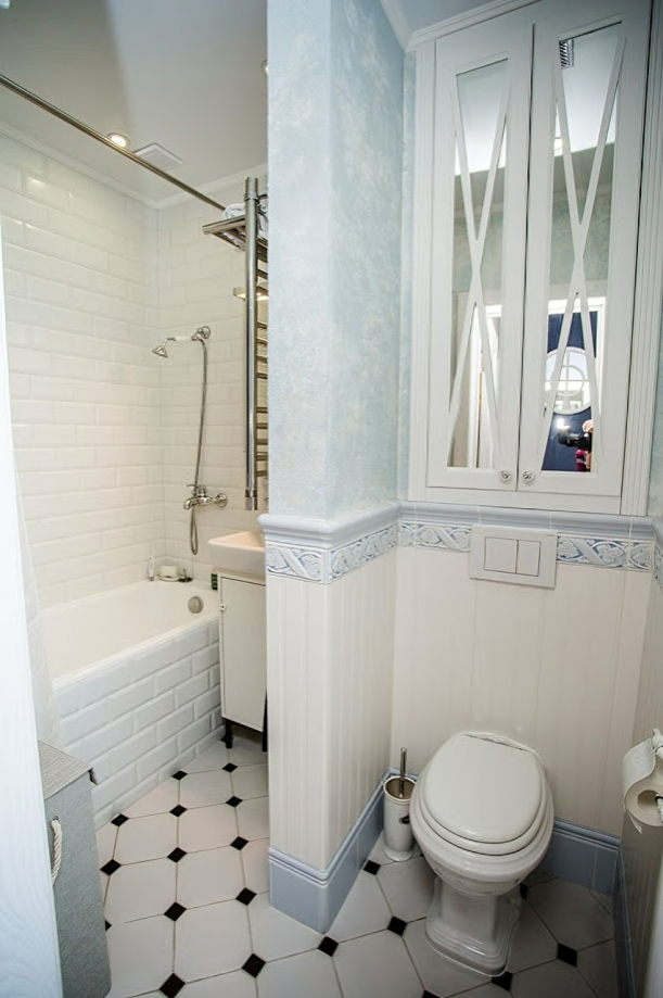 В крошечной комнате нет места для тяжёлых тёмных оттенков, слишком ярких и неоновых цветов. Классический вариант – белая отделка, но некоторым она может показаться слишком скучной. Поэтому не бойтесь работать с цветом, разбавляйте белый другими приятными колерами. Например, хорошо в маленьком санузле будут смотреться сочетания белого с голубым, бирюзовым, салатовым и… чёрным! Да-да, хоть это и самый тёмный из цветов, его актуально использовать для напольного покрытия. Во-первых, это практично, а во-вторых, с его помощью вы сделаете нужный акцент и разбавите белоснежную стерильность.