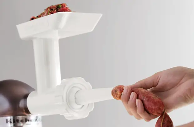 Мясорубка нам так или иначе понадобится — для производства фарша. Ее же можно будет использовать для набивки оболочки фаршем, для чего потребуется снять нож и решетку, а вместо них накрутить специальную насадку в форме трубки, которая в идеале идет в комплекте вместе с мясорубкой. Везде, где возможно, следует пользоваться специальным оборудованием — это шприц с ассортиментом насадок (или так называемых цевок) различного диаметра. Модель может иметь горизонтальное или вертикальное позиционирование: первый вариант удобен при наличии на столе достаточного количества места, второй — в обратной ситуации. Имевшие опыт общения со шприцем отказываются даже сравнивать его с мясорубкой — совершенно другой уровень.