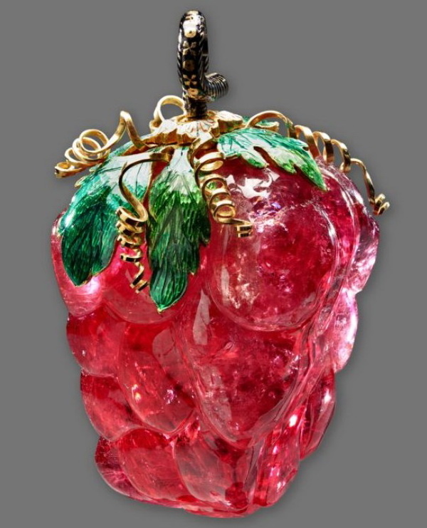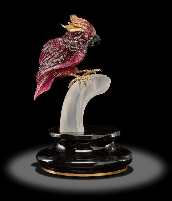 Какаду из рубеллита работы Манфреда Вильда, высота 15 см, Идар-Оберштайн, Германия. Птица вырезана из крупного рубеллита весом около 635,5 карата, с лапками и гребнем из золота, бриллиантовыми глазами, и клювом из турмалина-индиголита. Подставка из обсидиана и горного хрусталя. Турмалины такого малинового цвета в наши дни называют рубеллитами. Многие разновидности турмалинов имеют собственное название: ахроит (бесцветный), верделит (зеленый), индиголит (синий), шерл (черный). Некоторые кристаллы турмалина бывают окрашены в несколько цветов. Минералы с красной сердцевиной, окаймлённой зеленой «корочкой», в быту называют «арбузным турмалином».