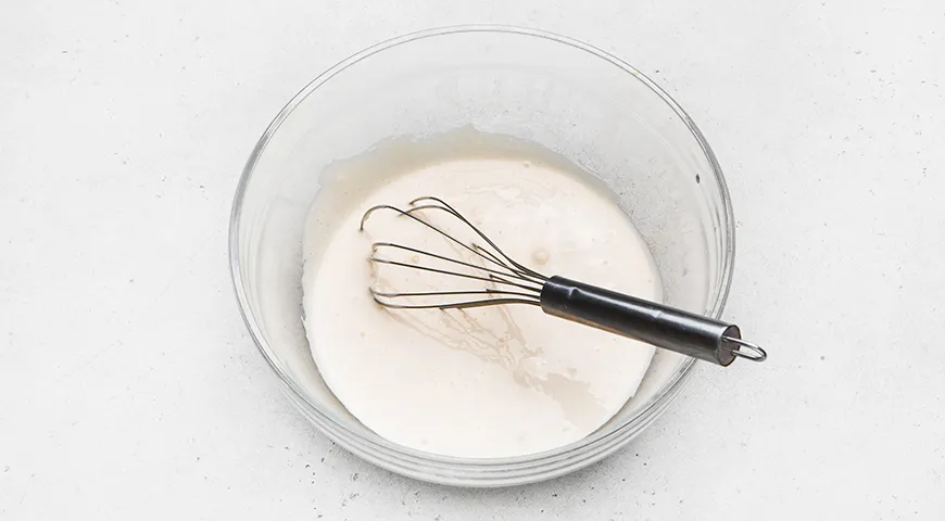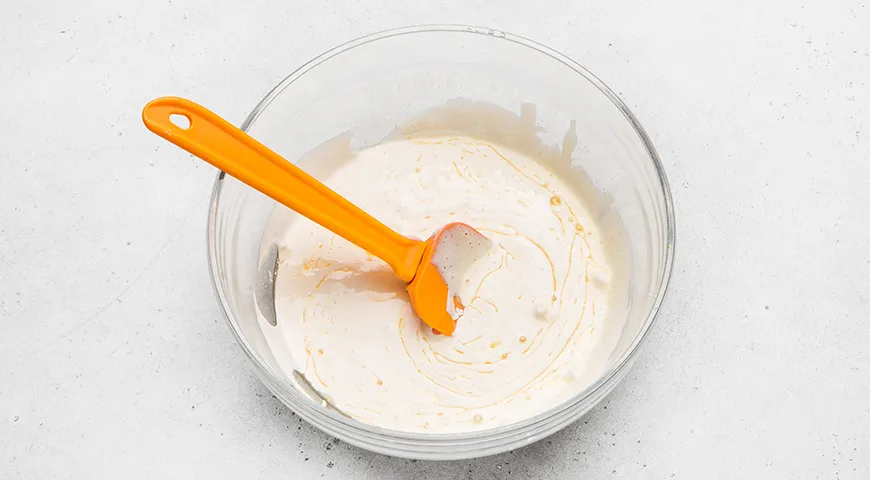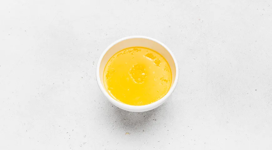 Отдельно просейте муку, добавьте к ней щепотку мелкой соли и пакетик разрыхлителя. Все перемешайте венчиком. В яйца добавьте растопленное теплое сливочное масло. Перемешайте аккуратно венчиком вручную или лопаткой.