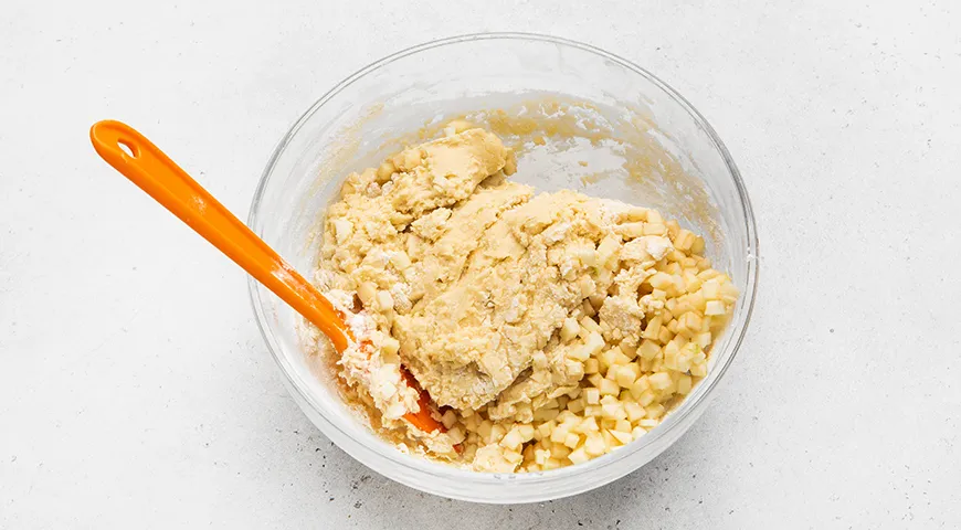 Вымойте и очистите яблоки, нарежьте маленькими кубиками, убрав серединку с семечками. Добавьте кубики в тесто и быстро перемешайте, чтобы они равномерно распределились в общей массе.