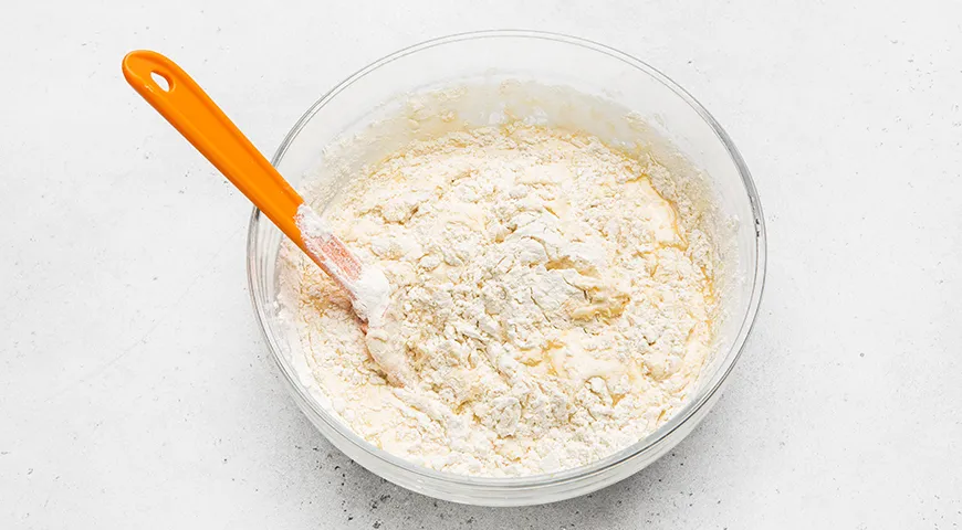 Добавьте подготовленные шагом ранее сухие компоненты, перемешайте с жидкими так, чтобы получилось густое тесто. Долго не вымешивайте, просто все соедините.