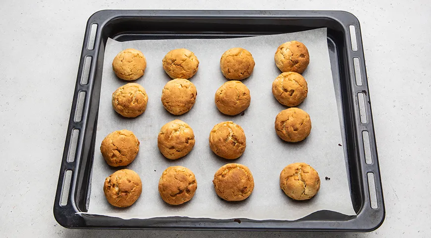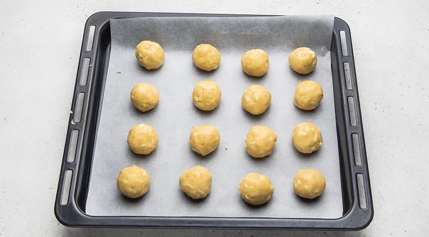 Руками сформируйте из теста довольно крупные мягкие печеньки — на данном этапе они будут в виде шариков. Разложите их на некотором расстоянии друг от друга на застеленный пергаментом противень.
