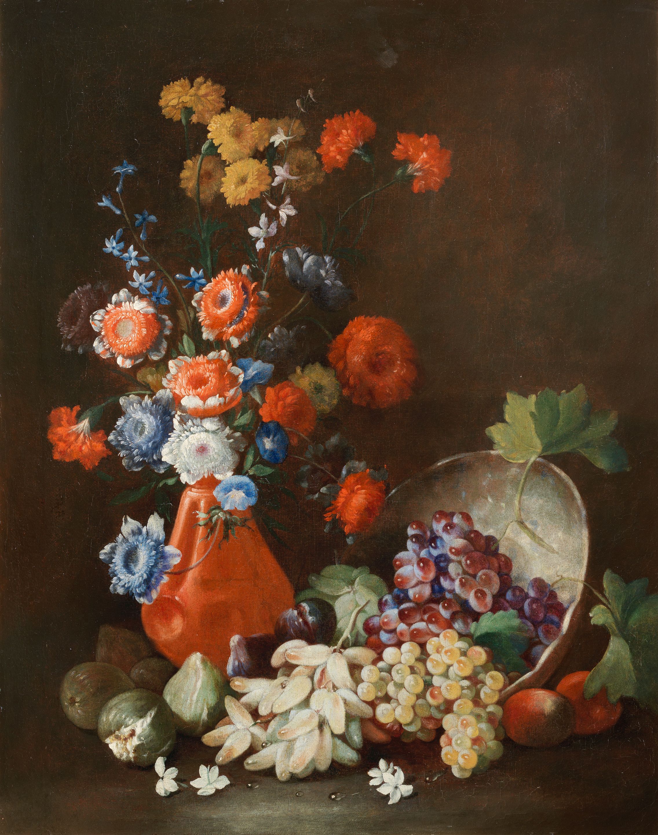 A terracotta vase filled with flowers beside an overturned pewter dish of grapes and figs