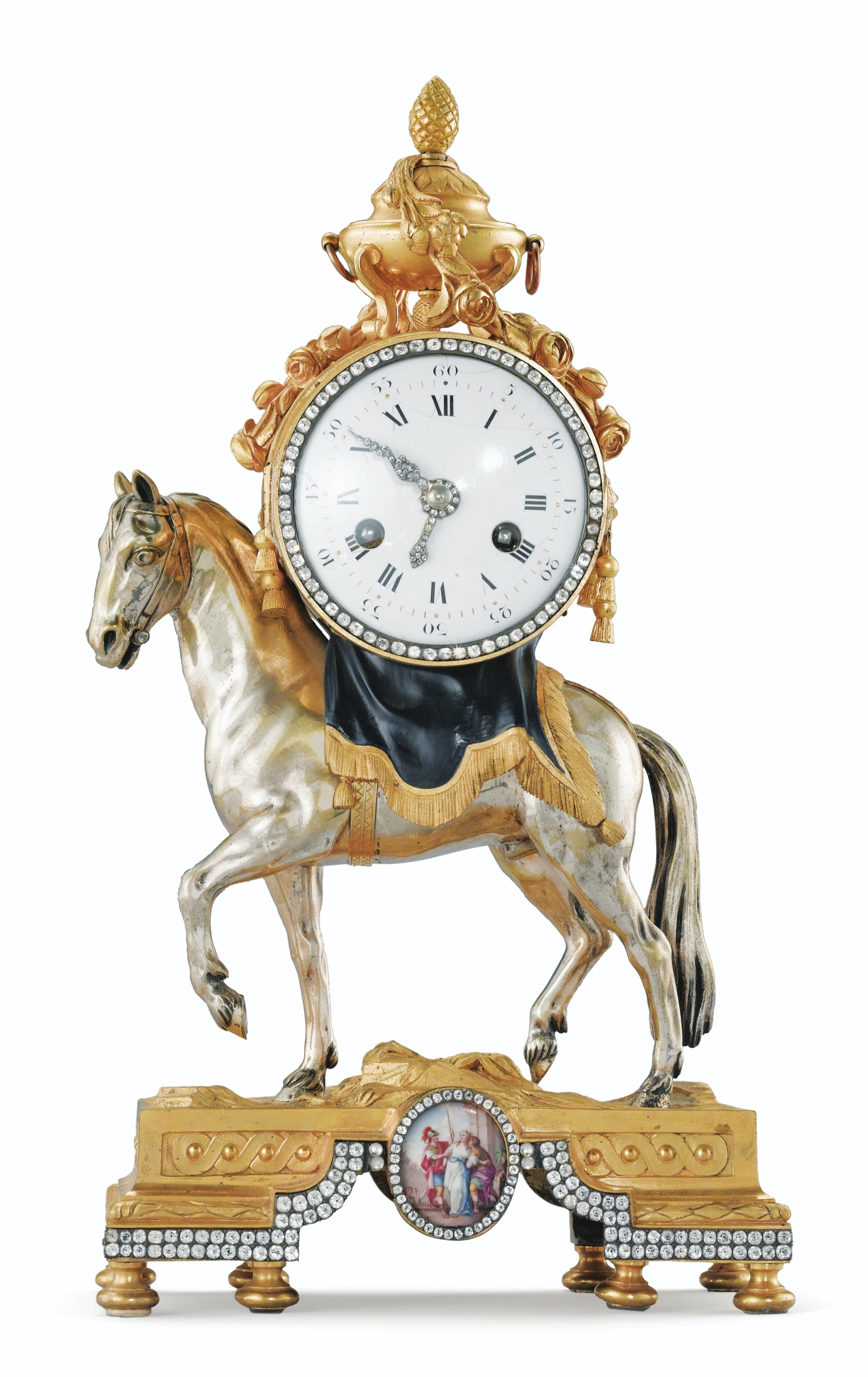 Pendule au cheval en bronze doré, argenté et laqué d'époque Louis XVI