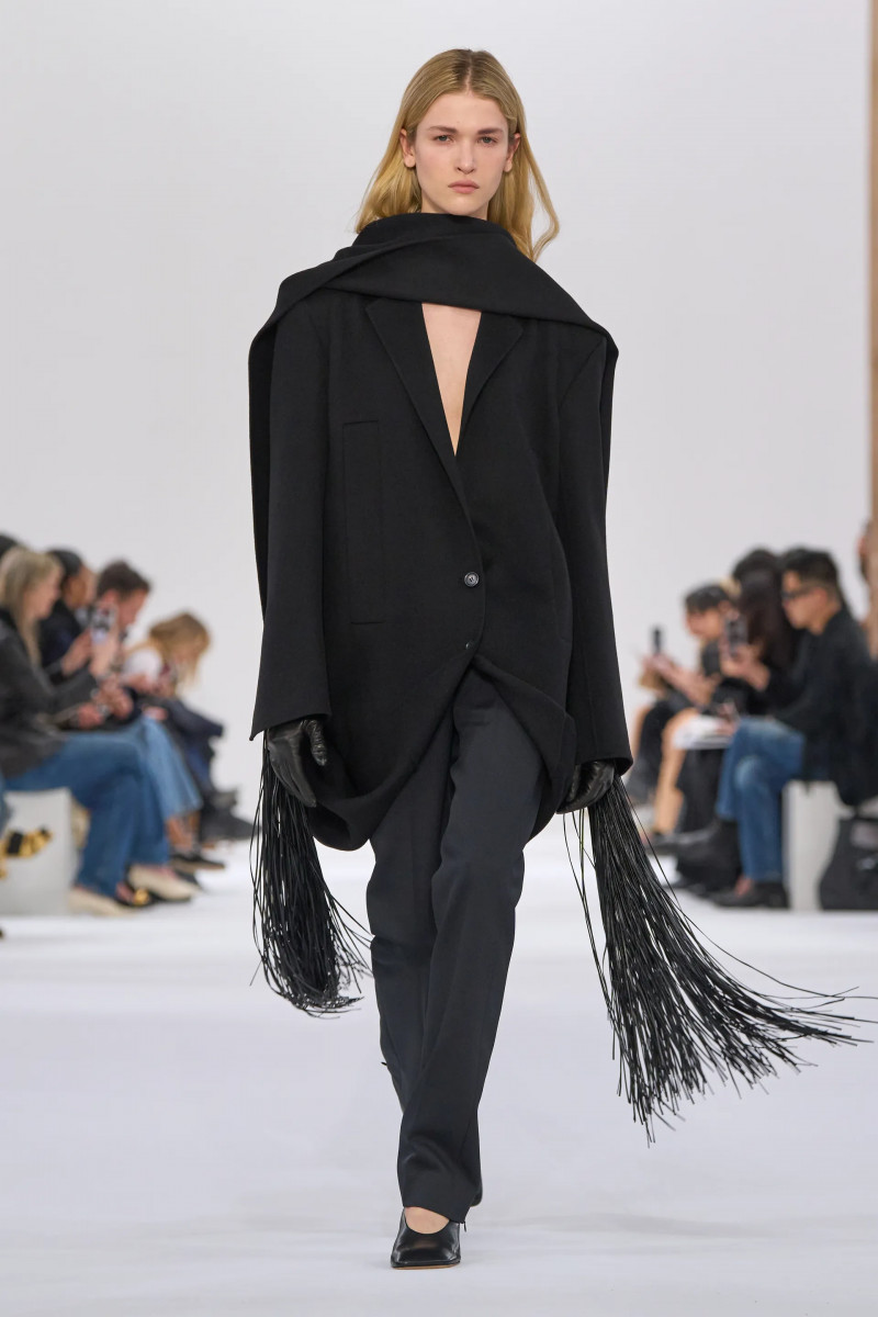 Особое внимание уделено деталям: бахроме, коже, приталенным силуэтам и сложному крою. Чистые силуэты, драпировки-шарфы, крупные сумки.