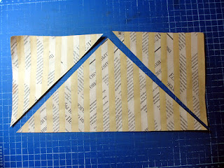 5.От полученного после склеивания квадрата снова отрезаем два треугольника. Линии отреза должны быть параллельны диагонали с одинаковым отступом (скажем, 1 см.) от диагонали в обе стороны таким вот образом: