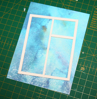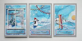 и штампики снежинок. Смысл идеи в следующем – акварельные разводы на листепослужат чудесным фоном для имитации зимней природы! Из этого листа у меня получилось как раз 3 открытки.