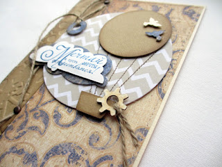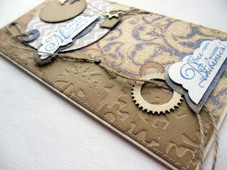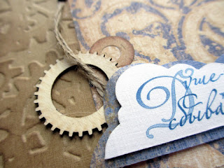 тиснение с винтажными шестеренками, джутовый жгут, деревянные фигурки-шестеренки, брадсы под медь, машинная строчка, тонировка краев.