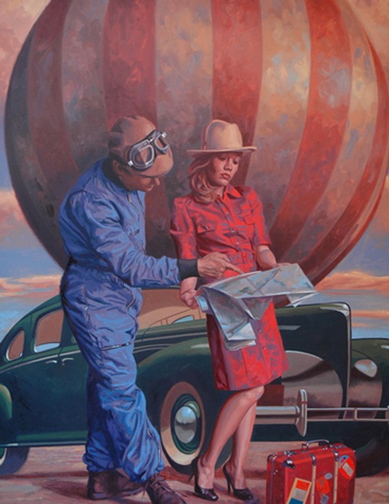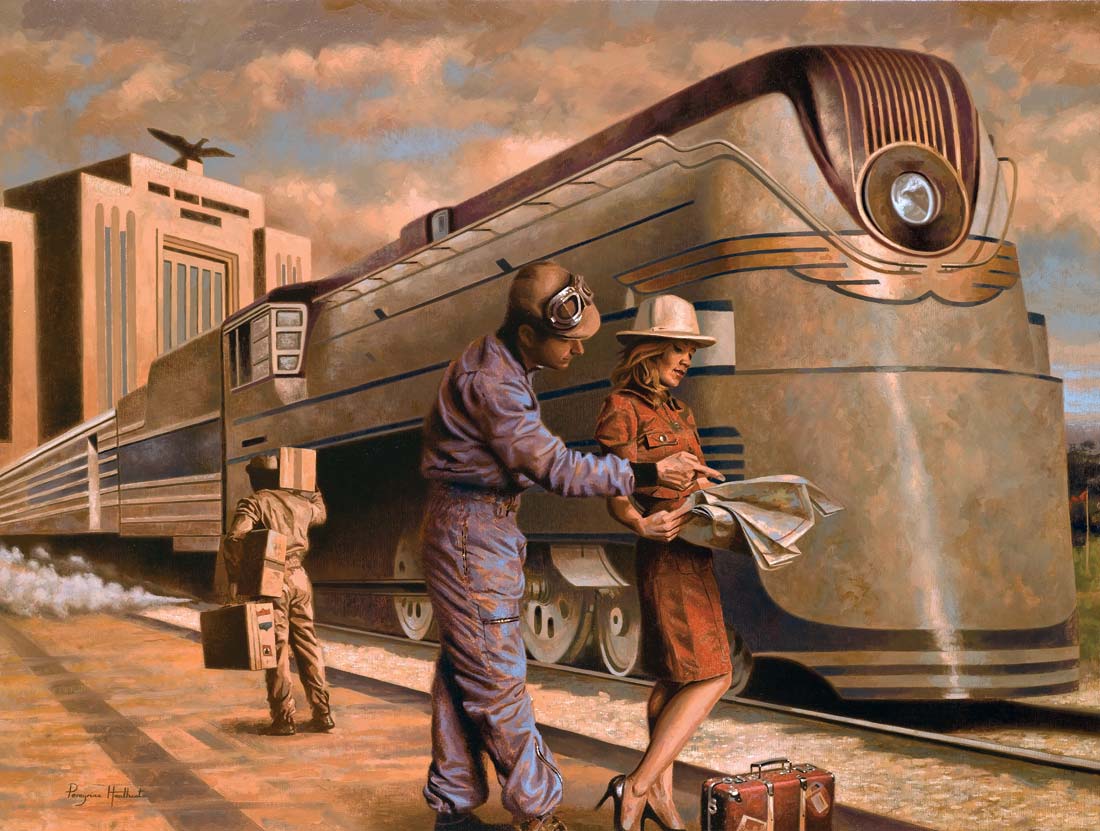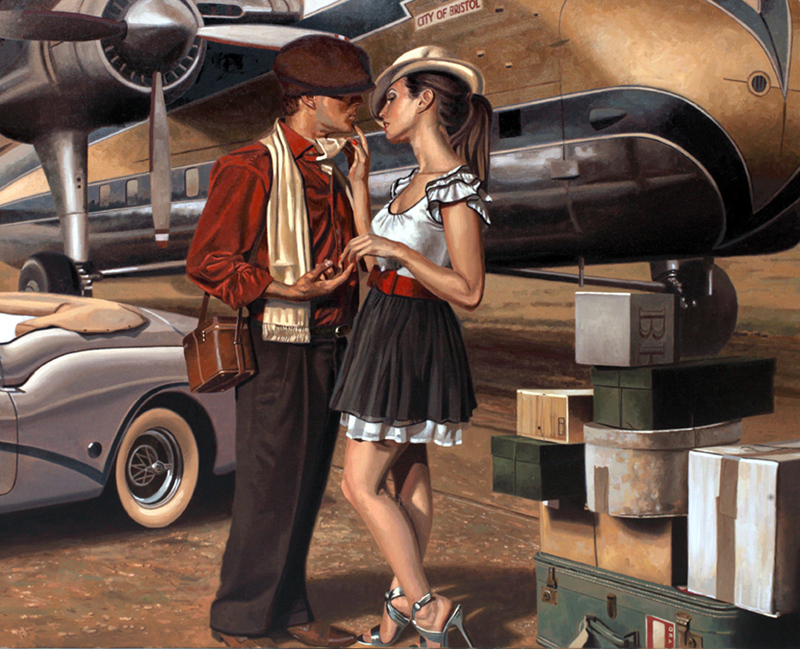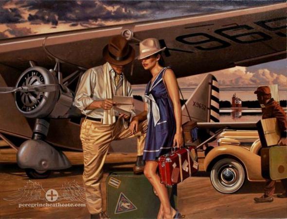 Картины Перегрина Хиткота (Peregrine Heathcote) способны позвать покорять неведомые дали убежденных домоседов. Возможно, дело не только в том, что основным сюжетом творчества этого художника является женщина в дороге. Предметом изображения служит также определенное время – середина прошлого века. Тогда расстояния были больше, дороги длиннее, а значит и путешествия – романтичнее. Возможно, наряды девушек не совсем отвечают эпохе. Любителям авиационной техники, скорее всего, легендарные самолеты покажутся недостаточно детализированными. Но художник никогда не претендовал своими произведениями на гиперреалистичность – он просто хотел позвать нас в дорогу, и это ему удалось. Персонажи времен Великого Гэтсби на фоне шикарных круизных лайнеров и автомобилей своей эпохи, ставшими для нас символами стиля ретро, будят в воображении роскошные, полные интриг путешествия.