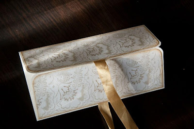 6. К заготовке приклейте ленту или тонкое кружево - это будущие завязочки нашего конверта. К слову, атласная лента прекрасно держится на клее-карандаше