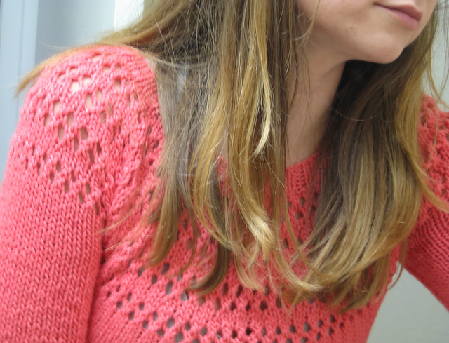 Round 1: K to first marker, sm, *k1, [k2tog, yo twice, k2tog] to last st before next marker, k1, sm, repeat from * twice more; k to end of round. Repeat Rounds 1-10 1[1, 1, 2, 2, 2, 2] more times. 200[200, 208, 248, 256, 256, 256] sts total: 50[50, 54, 66, 70, 70, 70] front sts, 50[50, 50, 58, 58, 58, 58] sts for each sleeve, 50[50, 54, 66, 70, 70, 70] back sts.