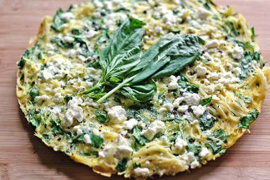 Итальянский омлет со спагетти, шпинатом, лимоном и сыром фета, посыпанный свежим базиликом.