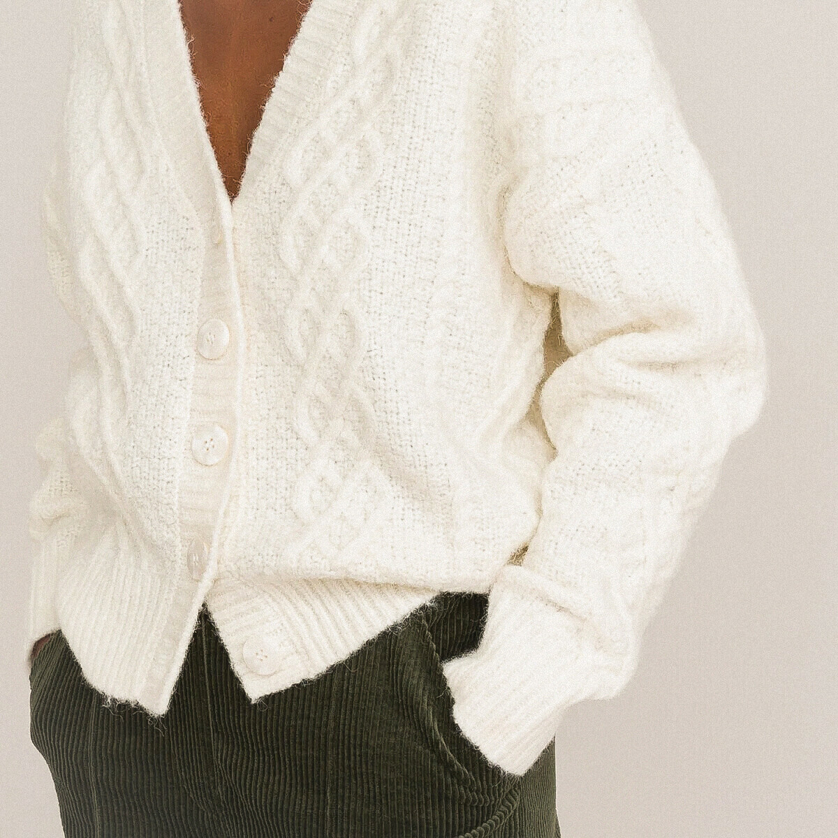 Кремовый кардиган на пуговицах, украшен незамысловатыми переплетениями, выполненными на фоне узора "рис".
