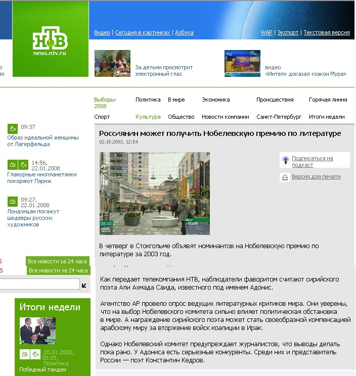В России к этому событию всегда относились с особым вниманием, и российские литераторы не теряют надежду, что в этом году премия может быть присуждена нашему соотечественнику. Среди номинантов этого года - поэт Константин Кедров. Лауреатами Нобелевской премии по литературе в свое время становились Иван Бунин, Борис Пастернак и Михаил Шолохов. В последний раз Нобелевская премия по литературе была присуждена российскому литератору в 1987 г.,