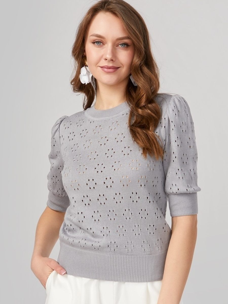 Первый свитер больше похож на блузу. У него круглый вырез горловины, втачной присборенный рукав 3\4. Это немного романтичная, но очень спокойная и универсальная модель.