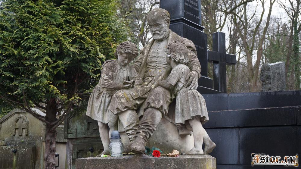 Это могила Юзефа Торосевича (1784-1869 гг.) - польского доктора медицины армянского происхождения. При своей жизни Торосевич прославился тем, что основал во Львове приют для детей-сирот, а после смерти завещал все свои сбережения детям-сиротам. Благодарные горожане в 1871 году установили на его могиле вот такое символичное надгробие – доктор прижимает к себе двух босоногих деток.