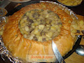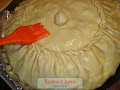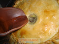 Через час вынимаем пирог, открываем шарик из теста и в отверстие вливаем немного мясного бульона или кипяченой воды, (не больше 100 мл).