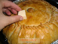 У готового балиша сначала вырезаем верхнюю лепешку, которую делим на части, (как бы открываем пирог). Затем каждый себе накладывает в персональную тарелку содержимое пирога.